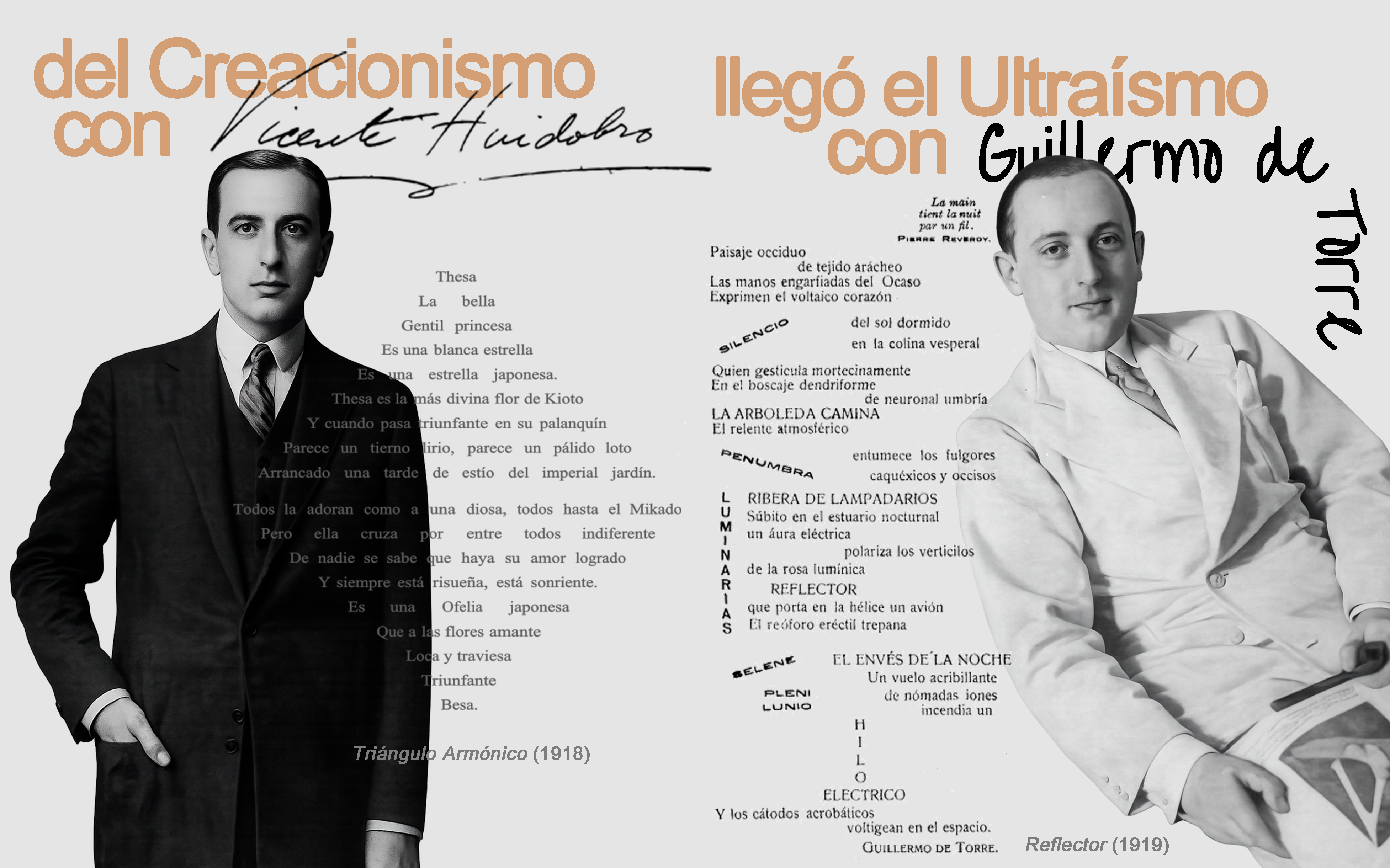 Influenciados por esta escena chilena y parisina, en el Café Colonial de Madrid se gesta el ultraísmo. El crítico Rafael Cansinos Assens habla de un “verbo nuevo” creacionista que, en palabras del poeta Guillermo de Torre, incubaría el “óvulo ultraísta”. Como reacción al modernismo, proponen la búsqueda de la máxima intensidad con los mínimos elementos. Se elimina lo ornamental con el uso de las metáforas sorprendentes y se estructuran poemas breves o visuales, a veces tipográficos.