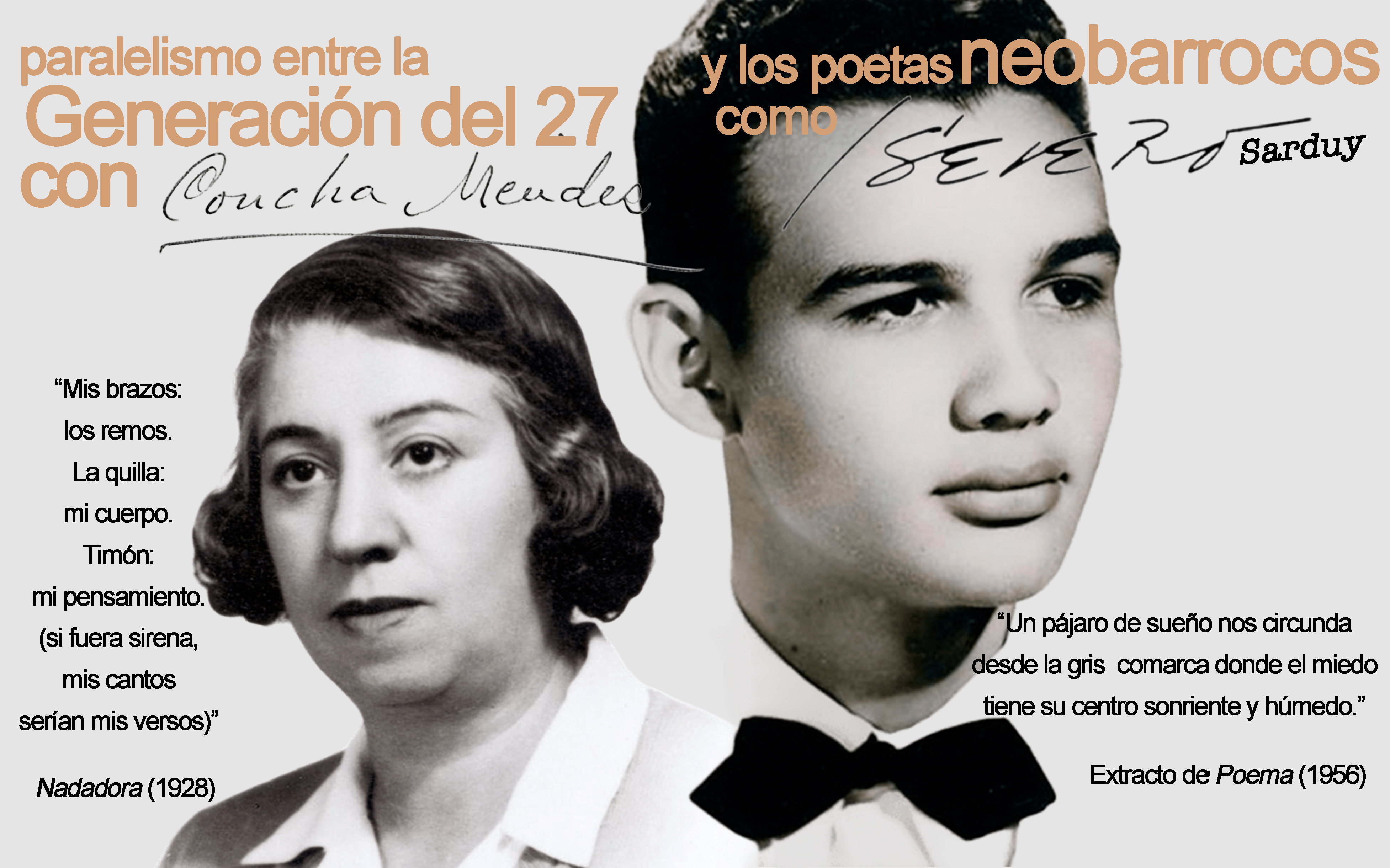 Figuras como Federico García Lorca o Concha Méndez, integrante de Las Sinsombrero, recuperan la herencia de Luis de Góngora y la proyectan hacia la modernidad, combinando tradición y experimentación formal en un contexto de intensa efervescencia cultural, previo a la Guerra Civil. Décadas más tarde, desde América Latina —y especialmente desde Cuba—, autores como José Lezama Lima y Severo Sarduy reactivan esa misma matriz barroca, pero la llevan hacia una radicalización del lenguaje: proliferación metafórica, densidad semántica, parodia e intertextualidad como formas de expandir los límites del sentido. Como en la Generación del 27, esta operación está atravesada por una relectura de la tradición; sin embargo, en el neobarroco esa herencia se revisita desde una sensibilidad marcada por las tensiones poscoloniales, que cuestionan la idea de una hispanidad homogénea y la reformulan como espacio de mestizaje, conflicto y resignificación.